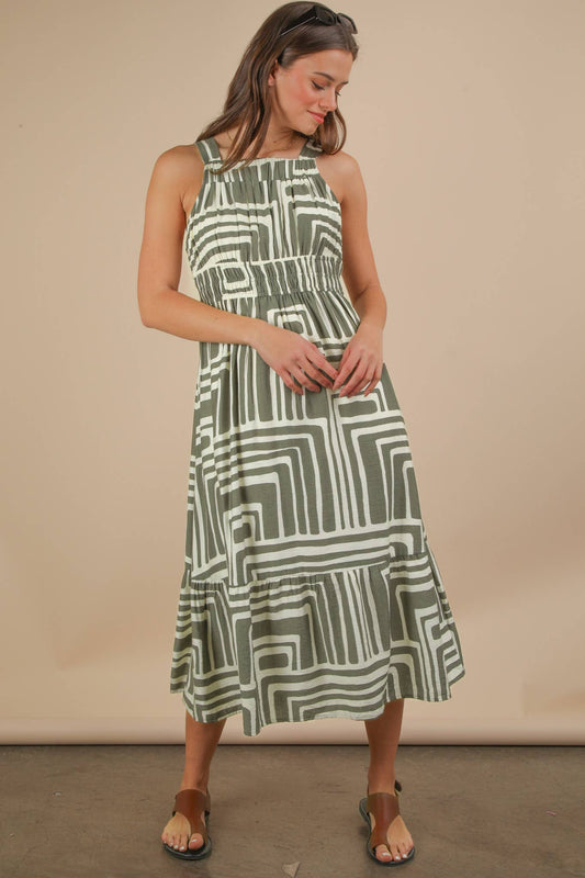 Olive/Cream Printed Summer Midi Boho Dress