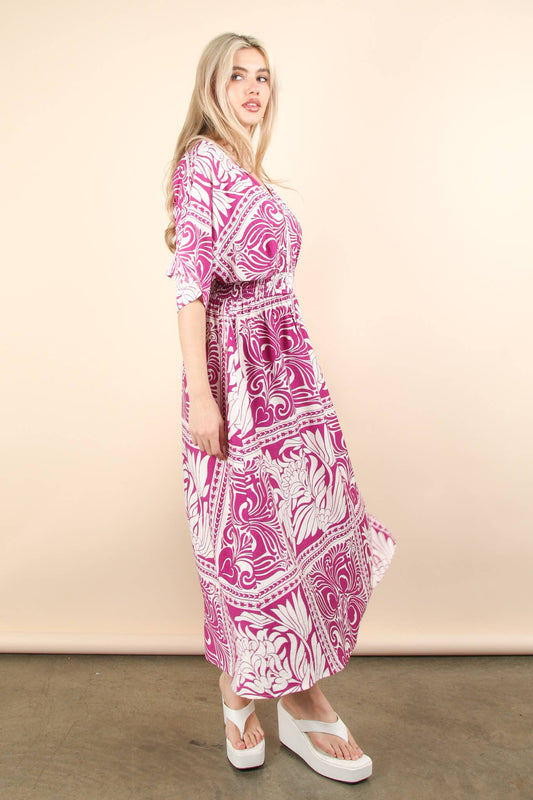 Fuchsia Printed V-Neck Boho Midi Dress