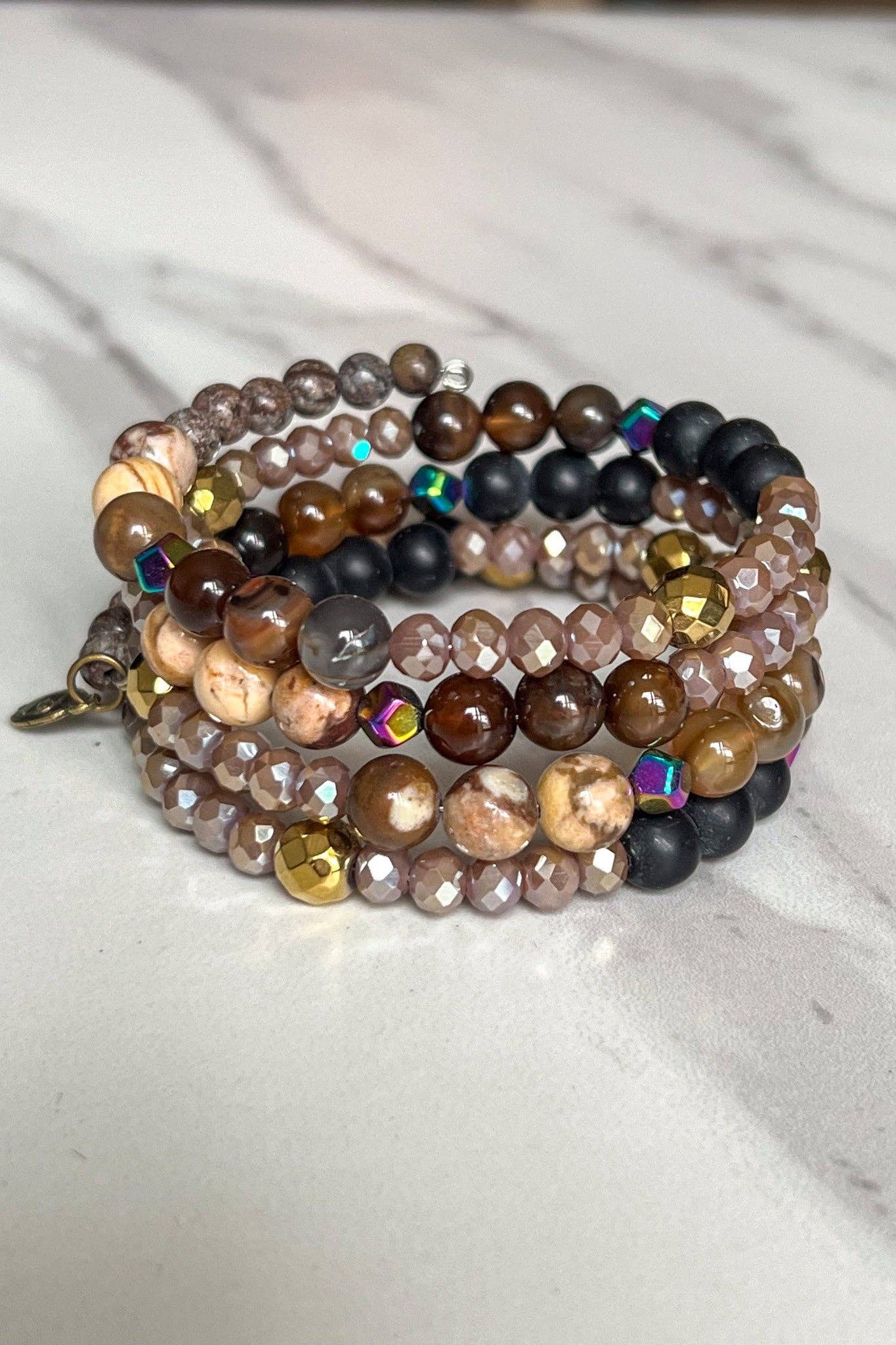 Slinky beaded bracelet with gold & grey mix stone beading. Gold accents throughout & bronze feather charm dangles.