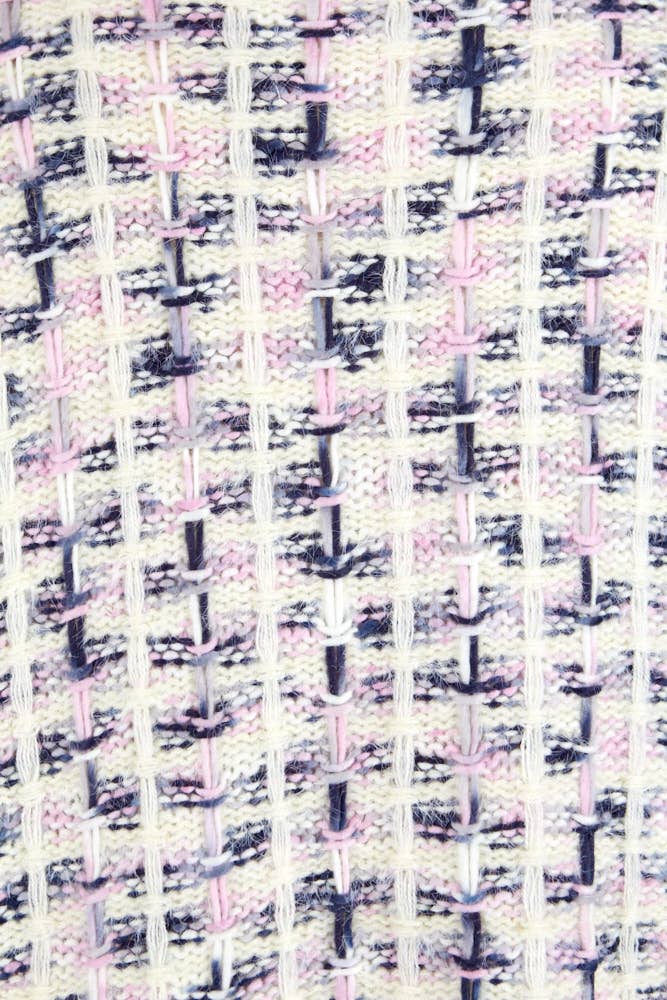 A refined cardigan crafted from multi-color yarn knit in soft pink, navy, and cream tones. Perfect for layering with effortless elegance.