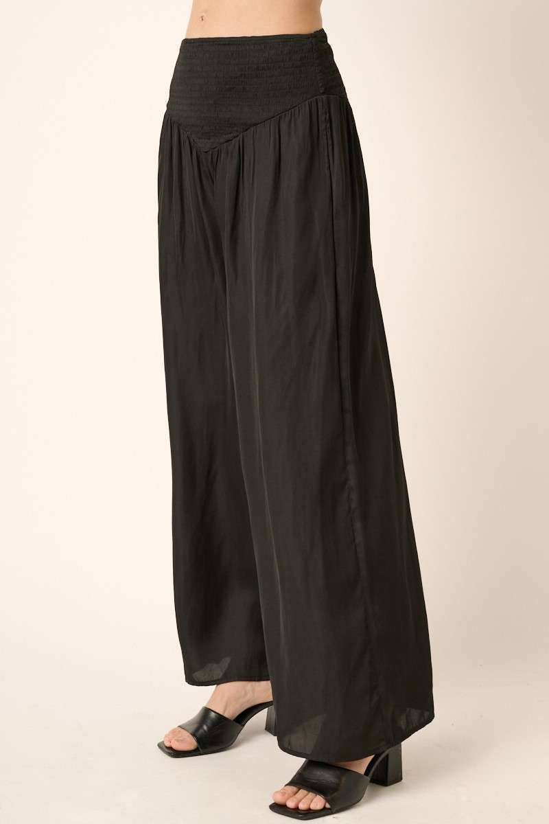 Elevate your wardrobe with our Judy's Smocked Satin Pants. Luxurious satin woven fabric and smocked detail waist create a sophisticated silhouette. Stay stylish and comfortable with side pockets and a flattering wide leg design. Perfect for a day at the office or a night out on the town.